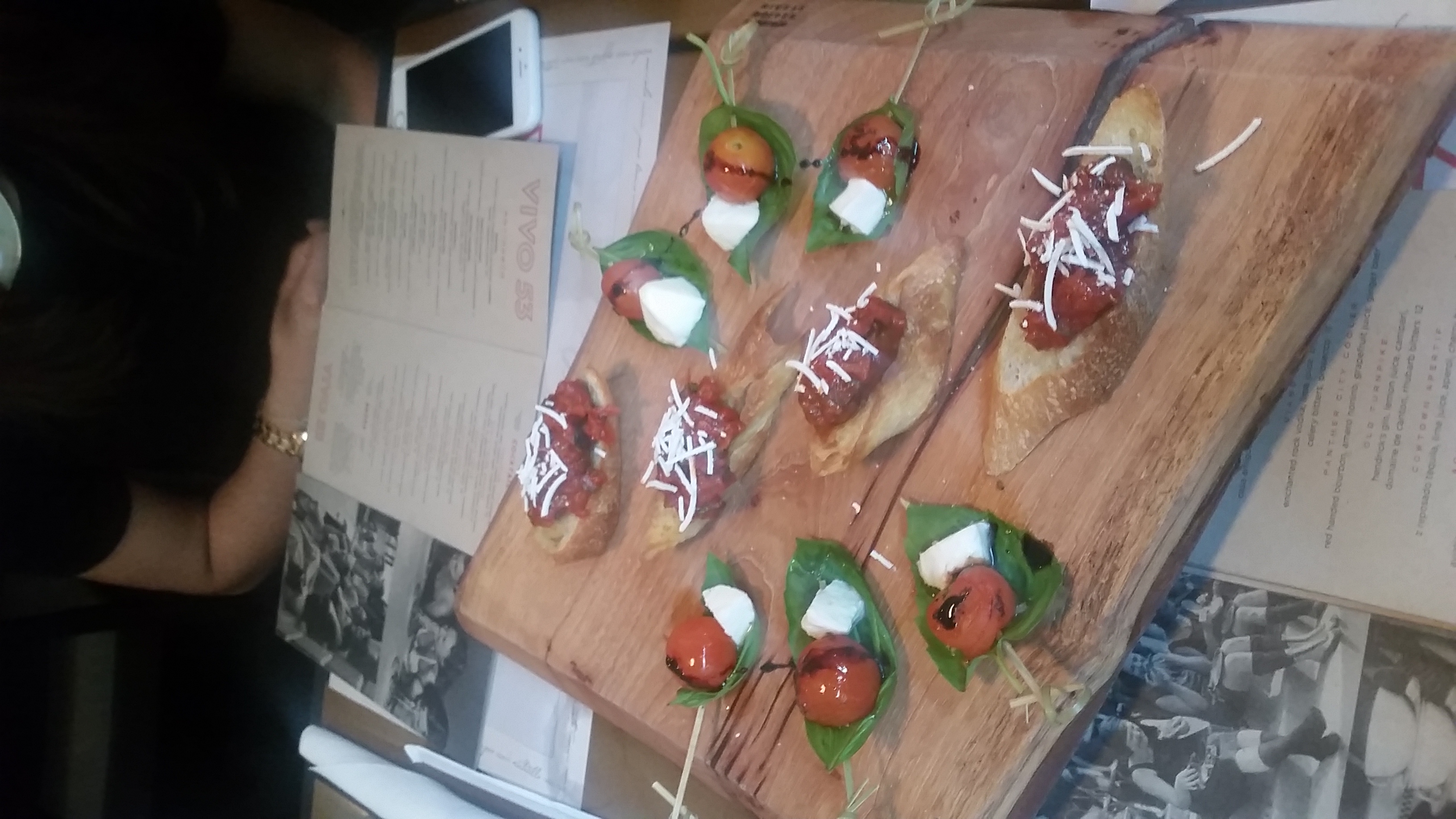 After indulging on a few sips of our cocktails, Dallas served us appetizers on a cutting board, which doubled as a cute platter. Once the appetizers were within reach, I immediately grabbed a Caprese Skewer. The skewers were the perfect size and the basil and sweet tomatoes were incredibly fresh. The skewers contained tomatoes, basil and mozzarella and were drizzled with balsamic vinegar. After downing a few skewers I wanted to test out some of the bruschetta. Vivo 53 has three bruschetta selections to choose from. I tried the version with fagioli (kidney beans), organic herbs, pickled chilies, extra virgin olive oil and sea salt. The bruschetta was served on crunchy French bread and, though I was nervous about the beans and pickled chilies in the bruschetta, it was a delightfully tasty surprise.