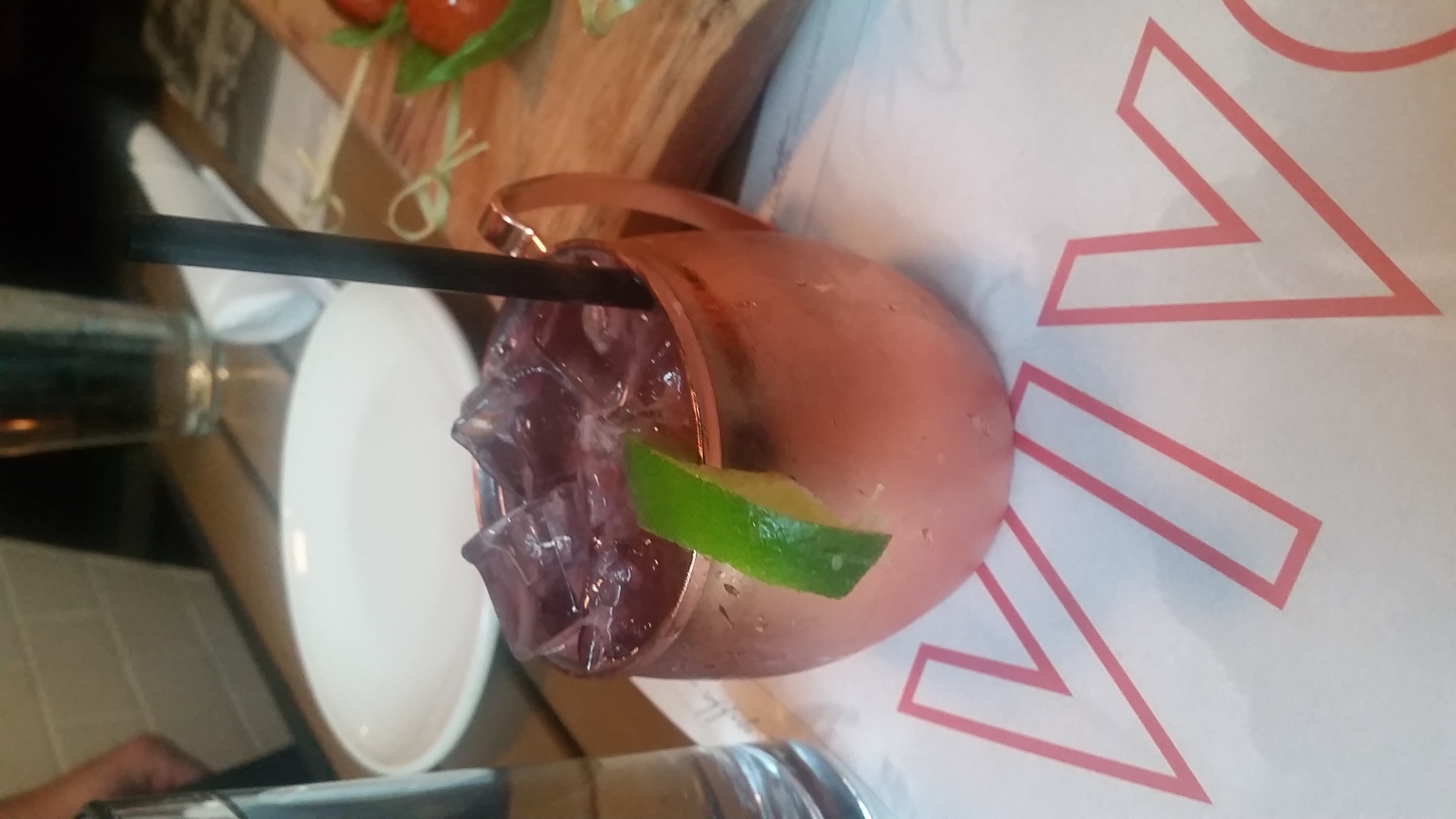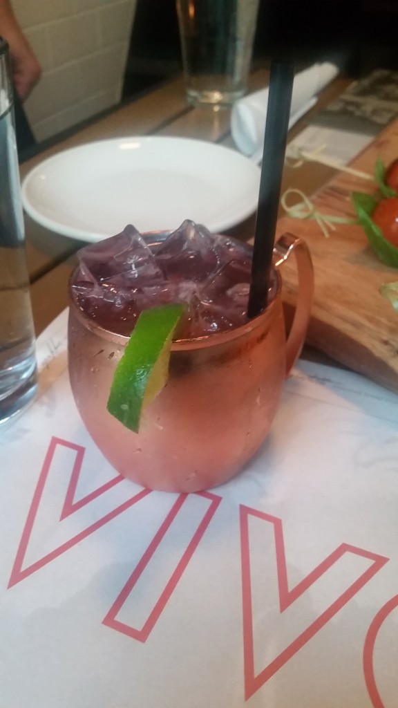 The Italian Mule was served in a customary rose gold mug (like a Moscow Mule) and was dressed with a lime. Upon initial taste, the ginger beer in this cocktail blew me away. I happen to love ginger beer, so I didnt mind the initial kick. This cocktail also has raspberries, organic vodka, lime juice and balsamic vinegar.
