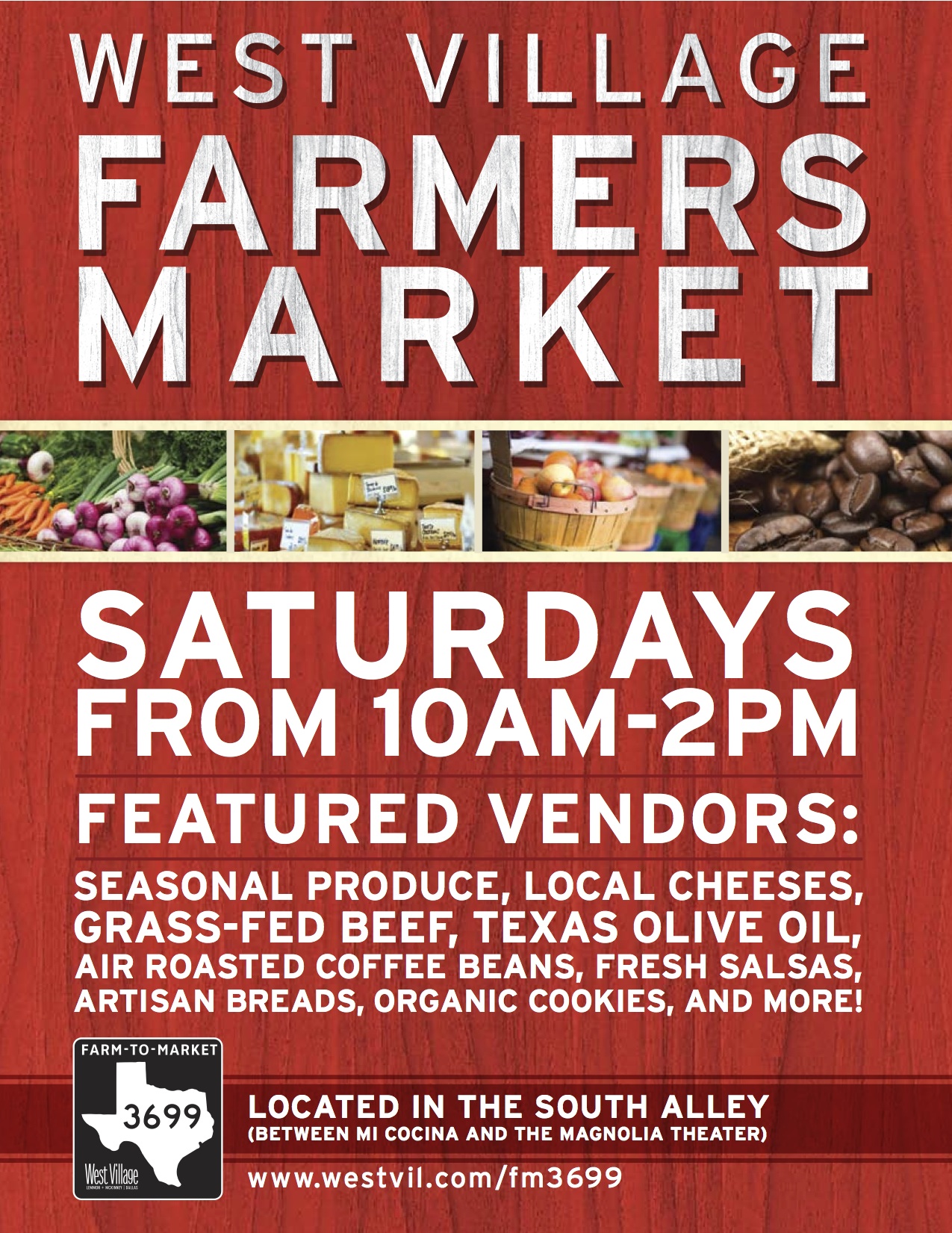 The West Village Farm-to-Market (FM 3699) featuring the seasons freshest produce, organic meats, and artisan goods will run every Saturday from 10 a.m. to 2 p.m. beginning Saturday, April 30. The Market, located between Mi Cocina and The Magnolia Theatre, kicks off on Saturday, April 30 with live music from Dallas own, Victor Andrada.