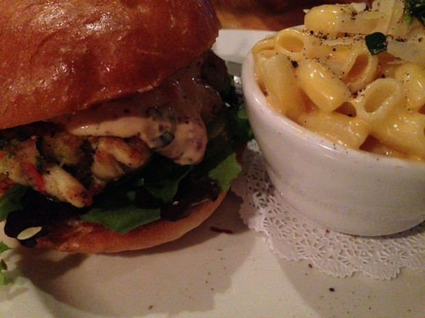 Her – Crab Cake Burger with Macaroni & Cheese: I didn’t know much about Lake House when I received the email invitation but as per usual I turned to Foursquare to see what my fellow food nerd friends had to say. There were numerous tips about the beer on tap but I was most excited about the Mac & Cheese. If there were qualification to call yourself a “foodie”, I’m not sure I’d be allowed to say that macaroni and cheese is my all time favorite food. But since I don’t really identify as a foodie anyway (I generally call myself a “carbotarian”) I can tell the truth and say if I had to pick between awesome beer or awesome mac and cheese chances are I’d pick the cheesy pasta goodness. And let’s just say their’s did not disappoint. No, that’s an understatement. I posted on instagram that Lake House’s macaroni and cheese was “quite arguably the best m&c I’ve had.” Since i knew I was ordering the mac and cheese I wanted an entree that would compliment the flavor. After narrowing down my choices I asked for Kyle’s vote and ended up with a Crab Cake Burger. Which was¦ excellent. Some crab cakes, even in high-end restaurants, taste like cornbread with a small amount of crab in it. This burger was the complete opposite, the crab ratio was amazing which also made it so filling.